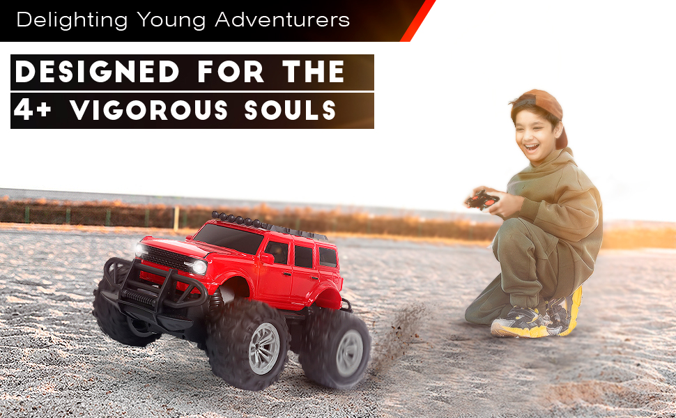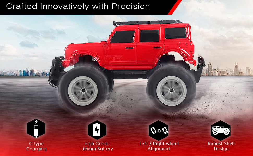 Popsugar of roadway rechargeable remote control car. Rc car monster truck. 4 headlight mode. Lithium battery. C- type charging. Remote control car for kids. Built in India, red